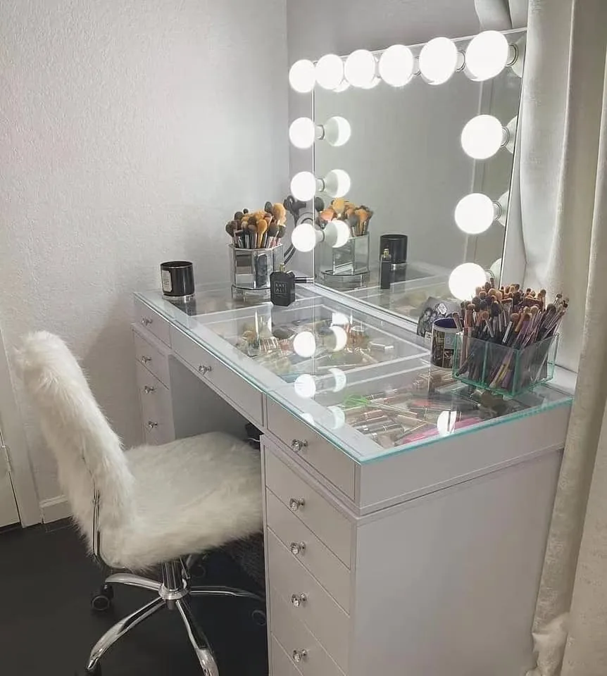 White lacquer on this Hollywood dressing table looks so sleek! MDF is sturdy enough for daily use, and it adds a chic vibe to my room. Totally worth it!
